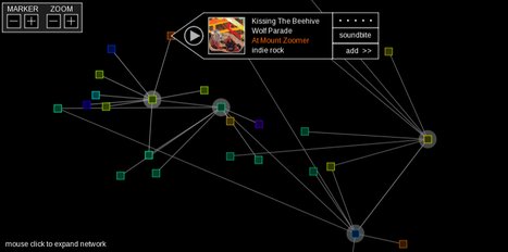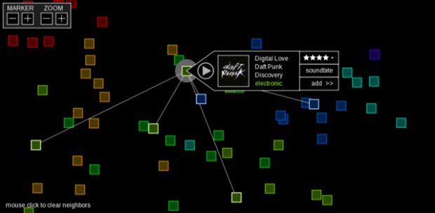 Steve Lloyd of Queen Mary University has released SongBite for Songbird. (Update – if the link is offline, and you are interested in trying SoundBite just email soundbite@repeatingbeats.com ). SongBite is a visual music explorer that uses music similarity to enable network-based music navigation and to create automatic “sounds like” playlists.