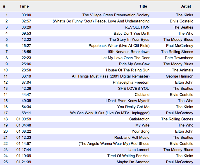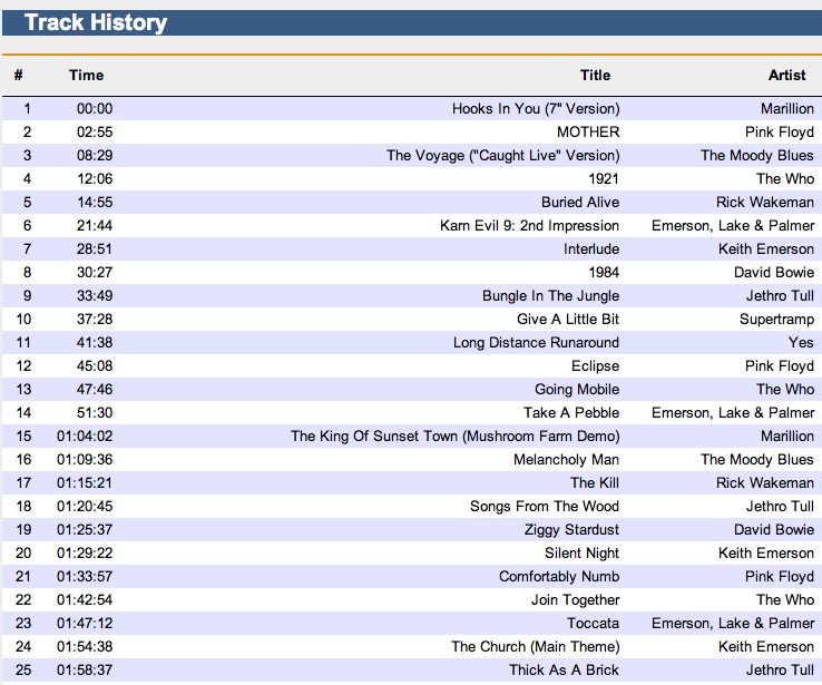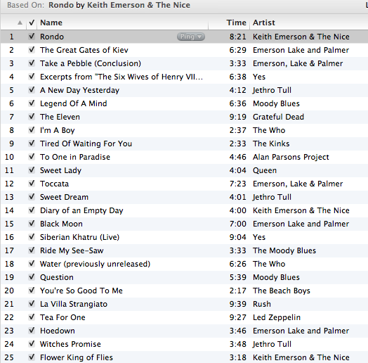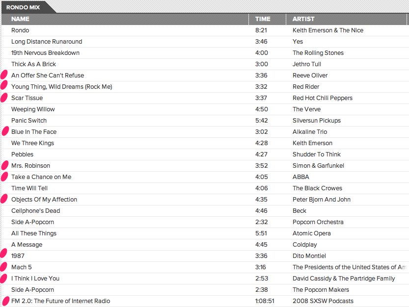 I would not like to listen to this playlist. It has a number songs that are just too far out. ABBA, Simon & Garfunkel, are WTF enough, but this playlist takes WTF three steps further. First offense, including a song with the same title more than once. This playlist has two versions of ‘Side A-Popcorn’. That’s a no-no in playlisting (except for cover playlists). Next offense is the song ‘I think I love you’ by the Partridge family. This track was not in my collection. It was one of the free tracks that Google gave me when I signed up. 70s bubblegum pop doesn’t belong on this list. However,as bad as The Partridge family song is, it is not the worst track on the playlist. That award goes to FM 2.0: The future of Internet Radio’. Yep, Instant Mix decided that we should conclude a prog rock playlist with an hour long panel about the future of online music. That’s a big WTF. I can’t imagine what algorithm would have led to that choice. Google really deserves extra WTF points for these gaffes, but I’ll be kind. WTF Score: 11