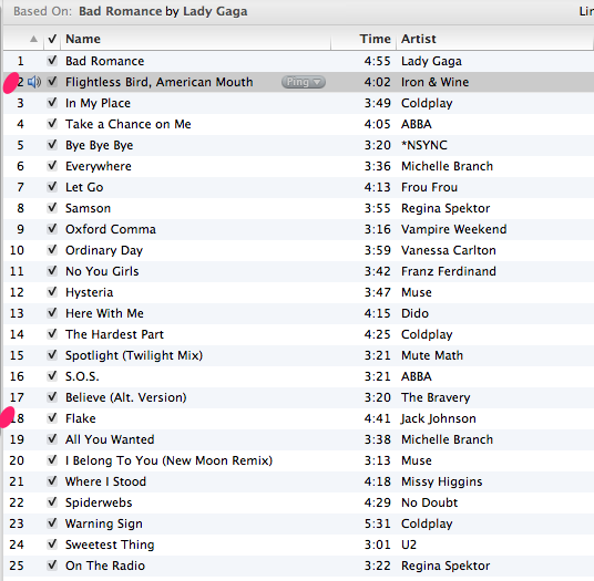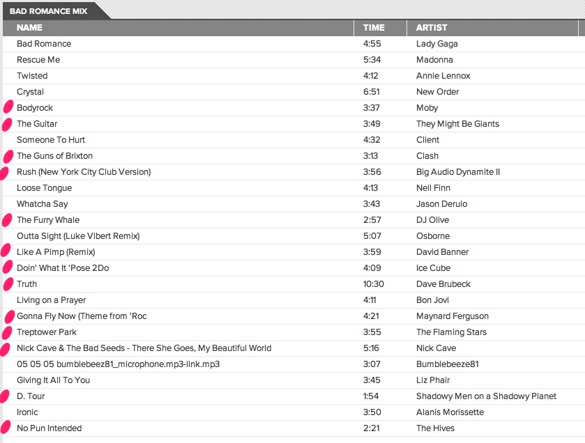 Google’s Instant Mix for Lady Gaga’s Bad Romance seems filled with non sequitur. Tracks by Dave Brubeck (cool jazz), Maynard Ferguson (big band jazz), are mixed in with tracks by Ice Cube and They Might be Giants. The most appropriate track in the playlist is a 20 year old track by Madonna. I think I was pretty lenient in counting WTFs on this one. Even then, it scores pretty poorly. WTF Score: 13