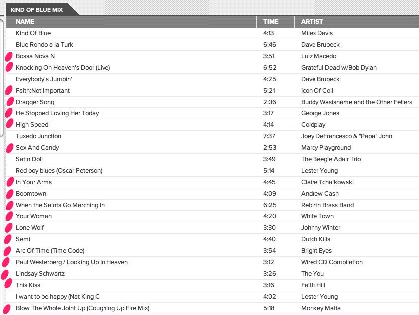 I’ve marked the playlist with red dots on the songs that I consider to be WTF songs. There are 18(!) songs on this 25 song playlist that are not justifiable. There’s electronica, rock, folk, Victorian era brass band and Coldplay. Yes, that’s right, there’s Coldplay on a Miles Davis playlist. WTF score: 18