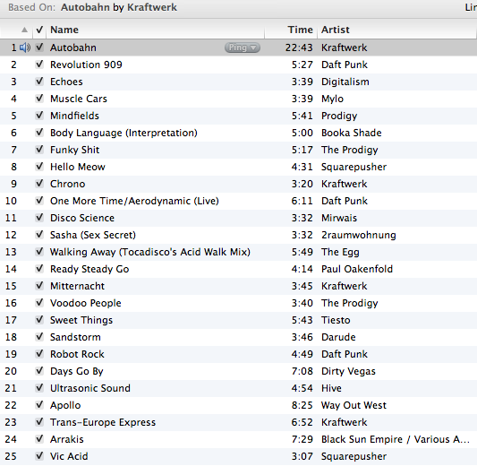 My experience of iTunes Genius is that it’s useful, but seems to be just grabbing a few similar artists based on the selected artist (not the track!) and then grabbing popular songs by them, a simple process with good results helped immensely by the fact that it’s choosing them from your own collection where you presumably like most tracks. Not that getting a workable result with a simple algorithm isn’t cool (quite the opposite) but it does have its weak points as shown by your first list, which is clearly terrible compared with your own APIs results and it seems likely, in my experience, that you’d get roughly that same playlist for any song by any of the highly popular artists on it, which is an even worse result. Also, despite having a collection that’s about as eclectic as your own, I feel that it sticks to the safer choices leaving large sections simply untouched over repeated playlists.