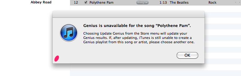 iTunes gets a bit WTF here. They can’t offer any recommendations based upon this song. This is totally puzzling to me since The Beatles have been available in the iTunes store for quite a while now. I tried to generate playlists seeded with many different Beatles songs and was not able to generate one playlist. Totally WTF. I think that not being able to generate a playlist for any Beatles song as seed should be worth at least 10 WTF points. WTF Score: 10