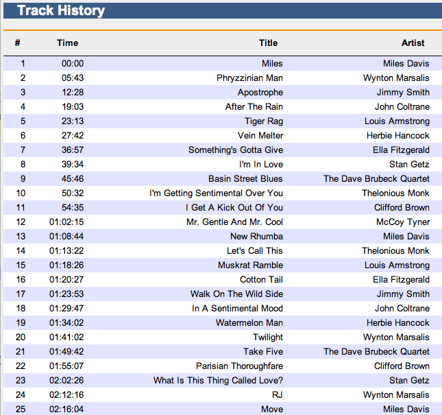 This looks like an excellent mix. All jazz artists. The most WTF results are the Blood, Sweat and Tears tracks – which is Jazz-Rock fusion, or the Norah Jones tracks which are more coffee house, but neither of these tracks rise above the WTF level. Well done iTunes! WTF score: 0
