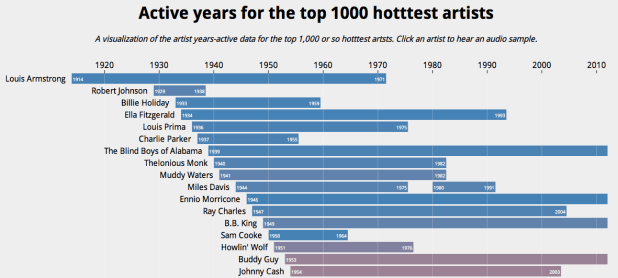 The visualization shows the artists in order of their starting year. You can see the relatively short careers of artists like Robert Johnson and Sam Cooke, and the extremely long careers of artists like The Blind Boys of Alabama and Ennio Morricone. The color of an artist’s range bar is proportional to the artist’s hotttnesss. The hotter the artist, the redder the bar. Thanks to 7Digital, you can listen to a sample of the artist by clicking on the artist. To create the visualization I used Mike Bostock’s awesome D3.js (Data Driven Documents) library.