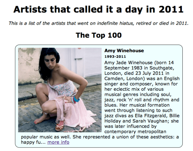 It is that time of year when music critics make their year-in-review lists: best albums, worst albums, best new artists and so on. To help critics with their year-end review, I’ve put together a list of the top artists that stopped performing in 2011 – due to retirement, breaking up or due to death.