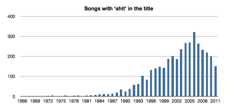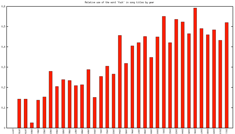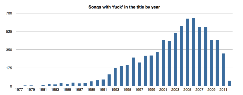 [youtube http://www.youtube.com/watch?v=J3wGresI0S4]The peak in usage of the word ‘fuck’ in song titles occurs in 2006 with 650 songs. Since then, peak usage has dropped off substantially, 2011 saw about the same ‘fuck’ frequency as 1999.
