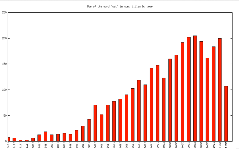 This plot shows a very similar usage profile for the word ‘cat’, with substantial growth in use from the 70s until 2006 when it starts to taper off. (Yes, ‘cat’ was found in many songs before 1976, but I am not showing those in the plot). Why do ‘fuck’ and ‘cat’ have such similar profiles? It is not because their usage frequency has increased, it is because the total number of songs released has been increasing year-over-year until 2006, after which the number of new releases per year has been dropping off. We see more ‘fuck’s and ‘cat’s in 2006 because there were more songs released in 2006 than any other year. For a more accurate view we need to look at the relative usage changes. This plot shows the usage of the word ‘fuck’ relative to the usage of other words in song titles. Even when we look at the use of the word ‘fuck’ relative to other words there is a clear increasing trend.