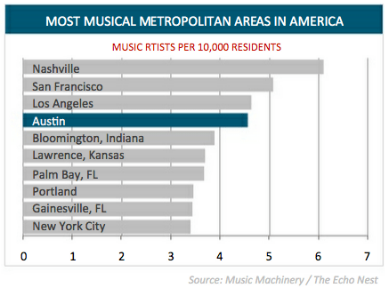 When data from The Echo Nest is adjusted to include metropolitan statistical area population data, the rankings of America’s most musical places changes significantly. Topping the list is Nashville, San Francisco and Los Angeles (which includes Beverly Hills). The Austin region jumps ten places from the original list to become America’s forth [sic] most musical region.