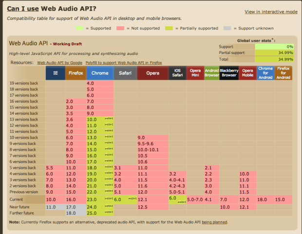 The good news is that Mozilla has announced that they will support the Web Audio API in an upcoming version of Firefox. It is on their roadmap, but it no date has been given. Even when they do though, there still is the problem that Firefox does not support the playing of MP3 audio. As for IE, Microsoft hasn’t announced any plans to support Web Audio.