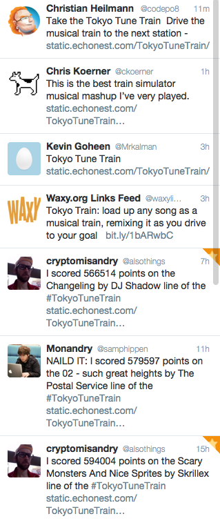 It was a great demo session at Music Hack Day Tokyo. There were easily 150 people crammed into the demo area – it was standing room only. The demo session was conducted in Japanese, so Taishi provided simultaneous translation for me. I was nervous giving the demo, so I let the train autopilot do most of the driving. The crowd seemed to really enjoy the demo, the hack got lots of votes for ‘favorite hack‘ on the hacker league page of hacks, and I got many compliments. I was pleased with the response and feedback