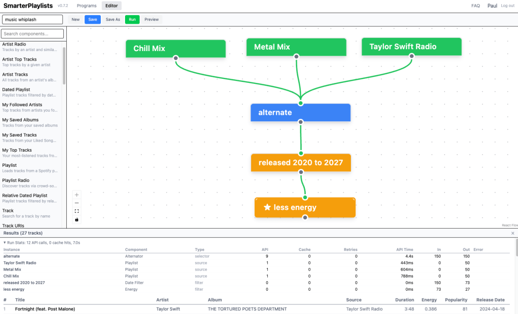 Here’s a screenshot of a simple program that grabs tracks from 3 playlists, combines them into a single alternating list of tracks, filtering them to keep only those that were released in this decade, and have lower energy. The stats section shows all the details – like the ‘alternate’ component is responsible for the most API calls since it is responsible for decorating the tracks.