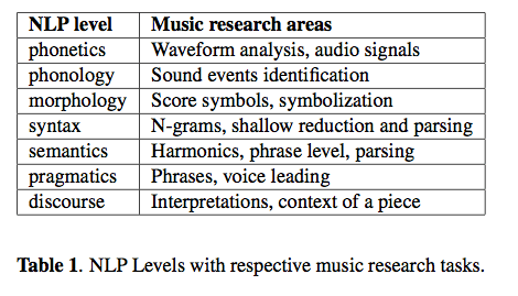 ABSTRACT – The hypothesis of the paper is that the domain of Nat- ural Languages Processing (NLP) resembles current re- search in music so one could benefit from this by employ- ing NLP techniques to music. In this paper the similarity between both domains is described. The levels of NLP are listed with pointers to respective tasks within the research of computational music. A brief introduction to history of NLP enables locating music research in this history. Pos- sible directions of research in music, assuming its affinity to NLP, are introduced. Current research in generational and statistical music modeling is compared to similar NLP theories. The paper is concluded with guidelines for music research and information retrieval.