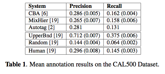Abstract:This paper examines the relationship between human generated tags describing different parts of the same song. These tags were collected using Amazon’s Mechanical Turk service. We find that the agreement between different people’s tags decreases as the distance between the parts of a song that they heard increases. To model these tags and these relationships, we describe a conditional restricted Boltzmann machine. Using this model to fill in tags that should probably be present given a context of other tags, we train automatic tag classifiers (autotaggers) that outperform those trained on the original data.