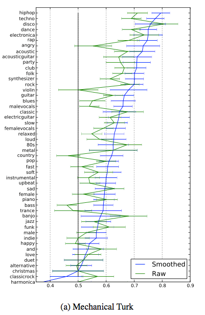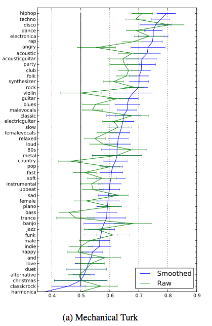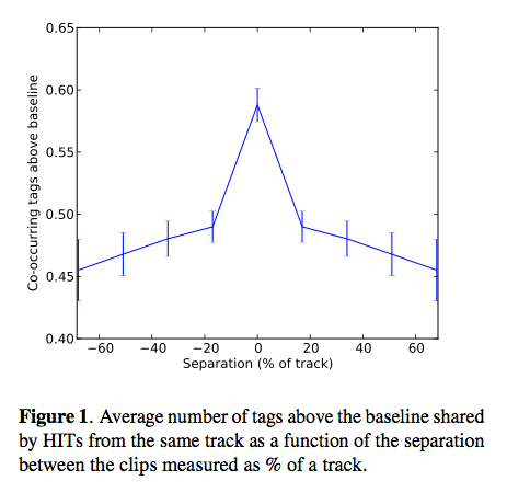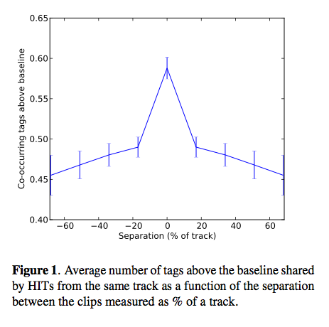 Michael enlisted the Amazon Turk to tag music. They paid for about a penny per tag. About 11% of the tags were spam. He then looked at co-occurence data that showed interesting patterns, especially as related to the distance between clips in a single track.