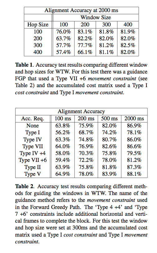 ABSTRACT – Dynamic Time Warping (DTW) is used to find alignments between two related streams of information and can be used to link data, recognise patterns or find similarities. Typically, DTW requires the complete series of both input streams in advance and has quadratic time and space requirements. As such DTW is unsuitable for real-time applications and is inefficient for aligning long sequences. We present Windowed Time Warping (WTW), a variation on DTW that, by dividing the path into a series of DTW windows and making use of path cost estimation, achieves alignments with an accuracy and efficiency superior to other leading modifications and with the capability of synchronising in real-time. We demonstrate this method in a score following application. Evaluation of the WTW score following system found 97.0% of audio note onsets were correctly aligned within 2000 ms of the known time. Results also show reductions in execution times over state-of-the- art efficient DTW modifications.