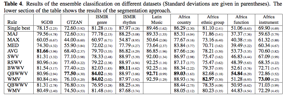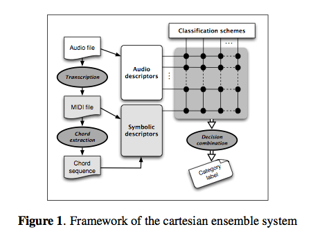 Abstract: We present a cartesian ensemble classification system that is based on the principle of late fusion and feature sub- spaces. These feature subspaces describe different aspects of the same data set. The framework is built on the Weka machine learning toolkit and able to combine arbitrary fea- ture sets and learning schemes. In our scenario, we use it for the ensemble classification of multiple feature sets from the audio and symbolic domains. We present an extensive set of experiments in the context of music genre classifi- cation, based on numerous Music IR benchmark datasets, and evaluate a set of combination/voting rules. The results show that the approach is superior to the best choice of a single algorithm on a single feature set. Moreover, it also releases the user from making this choice explicitly.
