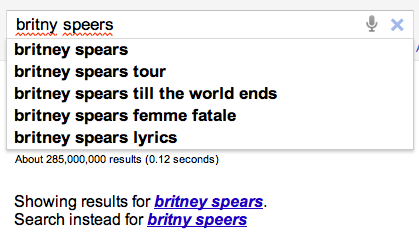 A few years ago, the smart folks at Google posted a list of Britney Spears spelling corrections that shows nearly 600 variants on Ms. Spears name collected in three months of Google searches. Perusing the list, you’ll find all sorts of interesting variations such as ‘birtheny spears’ , ‘brinsley spears’ and ‘britain spears’. I suspect that some these queries (like ‘Brandi Spears’) may actually not be for the pop artist. One curiosity in the list is that although there are 600 variations on the spelling of ‘Britney’ there is exactly one way that ‘spears’ is spelled. There’s no ‘speers’ or ‘spheres’, or ‘britany’s beers’ on this list.