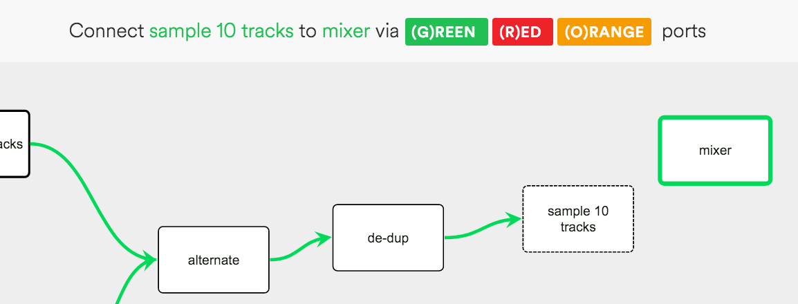 There’s still another problem. A good playlist usually won’t have adjacent songs by the same artist. With this current program, there’s nothing to prevent that from happening. To fix this we can add a separate artists node. This component will reorder the tracks passing through it to minimize the number of adjacent songs with the same artist