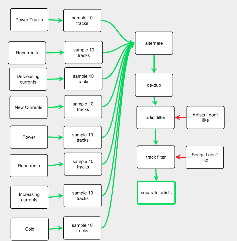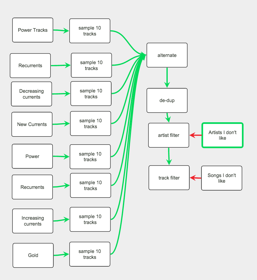 The de-dup node will remove any song from the stream of tracks bound for our playlist that have already been added to the playlist. While we are at it, we may want to remove other offending songs. We could, of course, just make sure that we don’t add songs we don’t like to the input playlists, but often times these playlists are not under our control – (I could be using the Spotify playlist Today’s Top Hits as my source for Power Tracks for example). Likewise, there may be some artists that I don’t particularly like. By adding an artist filter and a track filter I can make sure my playlist is free from any songs that I don’t like: