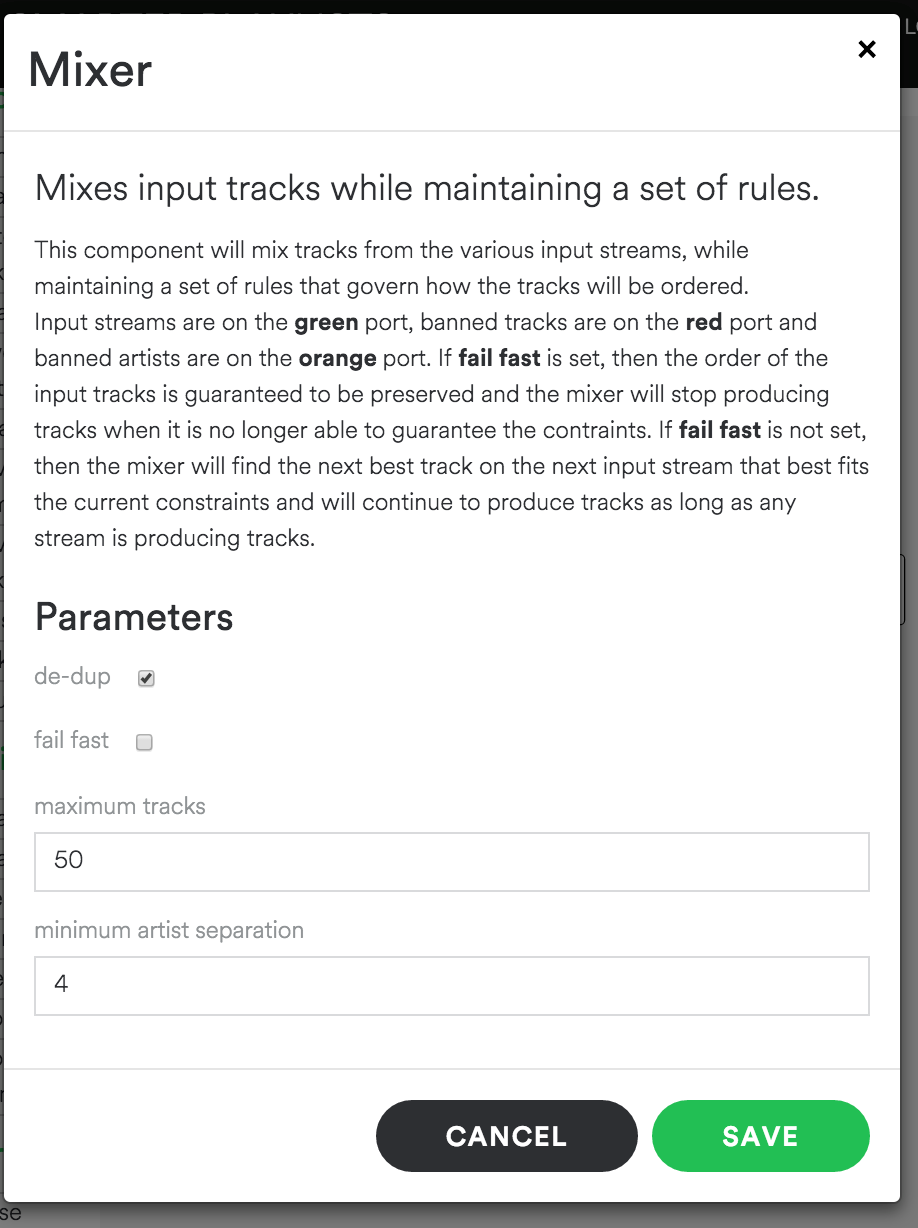So what do we do if we want to enforce a repeat song cycle, but still enforce a set of rules to ensure that we get a good playlist without repeating songs, artists and so on? We can use the newly added Mixer component! The Mixer is designed for this very situation. It is essentially an Alternator component but with all of the typical post-filtering built in, so you can generate a cycle of songs that respect all of the rules of a good playlist.