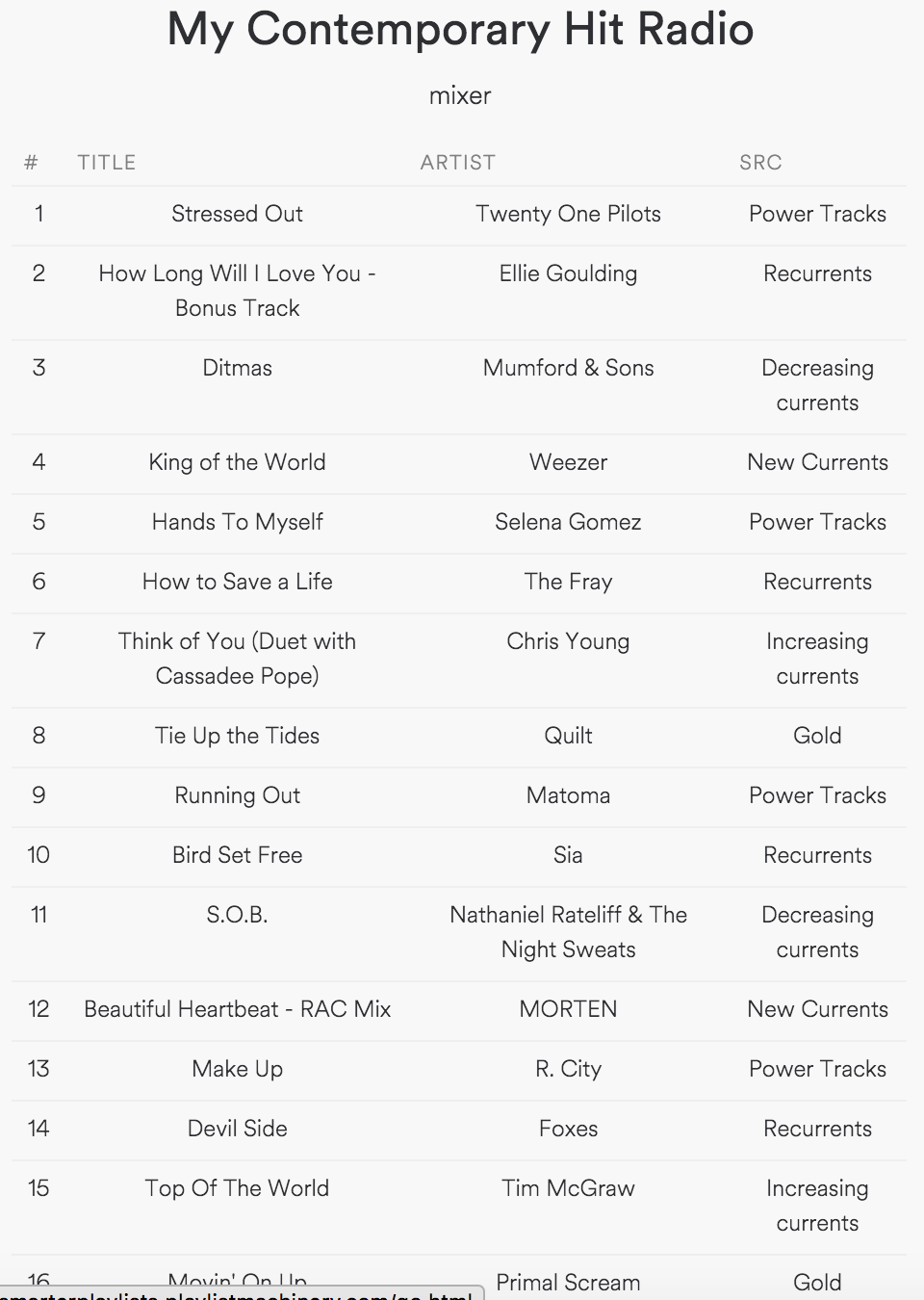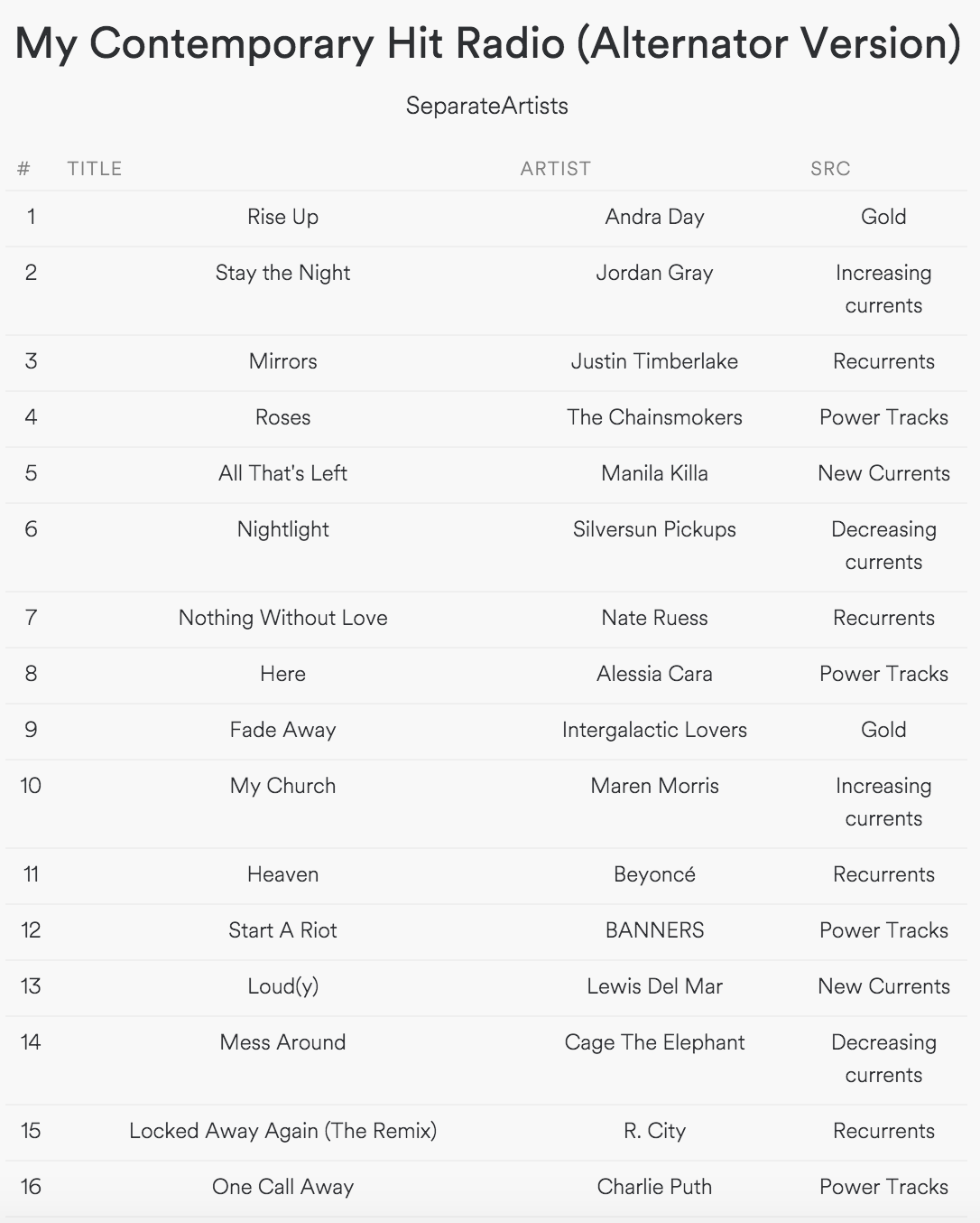 As you can see, the Mixer has builtin support for de-duping tracks, maintaining a minimum artist separation and track filtering by banned artists and tracks. Inspecting the output of the program we can see that all the rules have been enforced (no dup tracks, no adjacent artists, no banned artists or tracks), and we are still respecting our repeating 8 song cycle of power / recurrent / decreasing / new / power / recurrent / increasing / gold tracks: