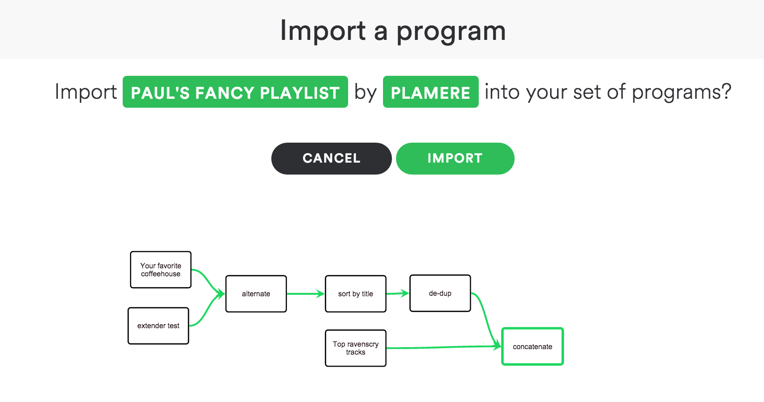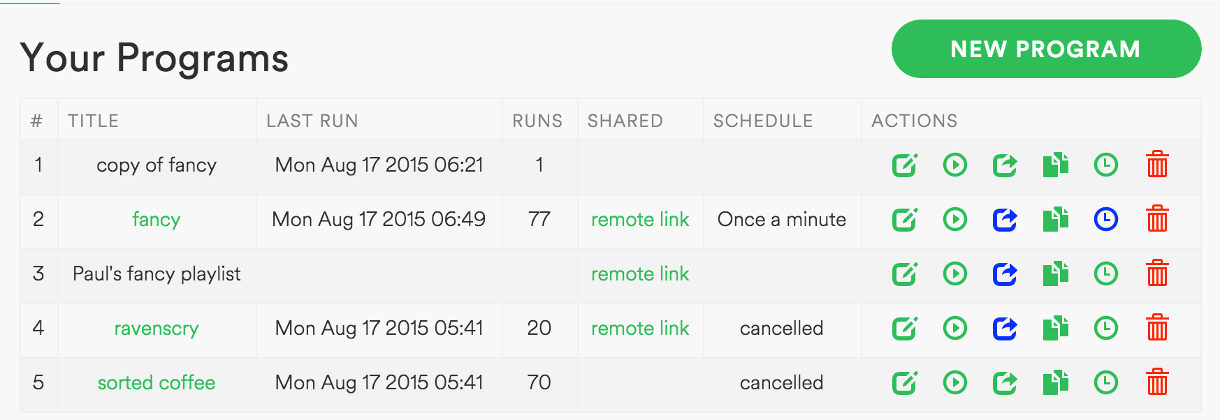 Under the hood, there are huge changes – programs are no longer saved in the browser, but instead are saved on the server. The authentication model has been upgraded to use the 3-factor version. This will allow me to run programs on the server side and have them update your playlists on your behalf. An essential capability for scheduling.