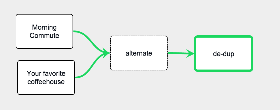 playlist_names = ['Your Favorite Coffeehouse', 'Acoustic Summer','Acoustic Covers', 'Rainy Day'] all = DeDup(Alternate([Sample(PlaylistSource(n), 10) for n in playlist_names]))