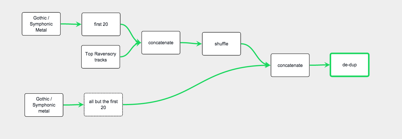 Here’s a more complex example that starts with a Gothic Metal playlist and mixes in the top tracks from the band Ravenscry into the first songs in the playlist.