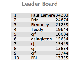 The biggest technical challenge in building the application was coming up with a credible fake artist name generator. I could have used Brian’s list of fake names – but it was more fun trying to build one myself. I think it works pretty well. I really can’t share how it works since that could give folks a hint as to what a fake name might look like and skew scores (I’m sure it helps boost my own scores by a few points). The really nifty thing about this game is it is a game-with-a-purpose. With this game I can collect all sorts of data about artist familiarity and use the data to help improve our algorithms.