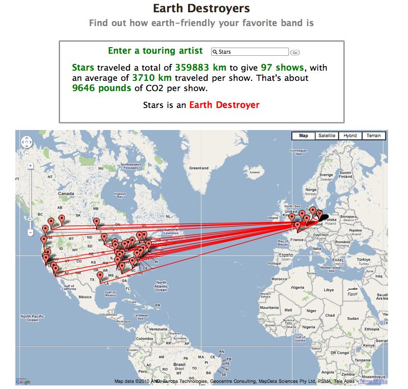 For my London Music Hackday hack I built a web app called ‘Earth Destroyers’. Give Earth Destroyers a band name and it will show you how eco-friendly the band’s touring schedule is. Earth Destroyers calculates the total distance traveled from the first gig to the last along with the average distance between shows. If an artist has an average inter-show distance of greater than a 1,000 km I consider it an ‘Earth Destroyer’. The app also shows you a Google map so you can see just how inefficient the tour is. To build the app I used event data from Bandsintown.