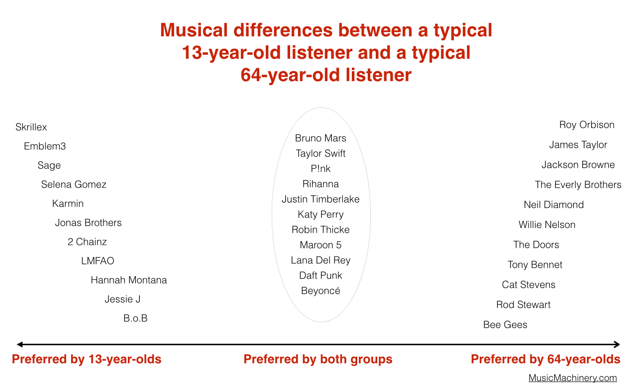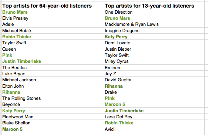 Artists that are favored by both 64-year-old and 13-year-old listeners are: Bruno Mars, Taylor Swift, P!nk, Rihanna, Justin Timberlake, Katy Perry, Robin Thicke, Maroon 5, Lana Del Rey, Daft Punk, Beyoncé, Drake, Luke Bryan, Adele, Macklemore & Ryan Lewis, Miley Cyrus, David Guetta, Lorde, Jay-Z, Usher