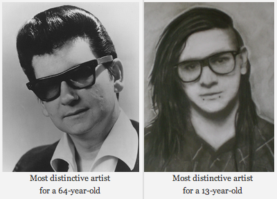 We can find the distinctive artists by identifying the artists in the top 100 of one group that fall the furthest in ranking in the other group. For example Skrillex is the 40th most listened to artist for the typical 13-year-old listener, but for 64-year-old listeners, Skrillex falls all the way to the 3,937 most listened to artist, making Skrillex one of the most distinguishing artist between the two groups of listeners. Likewise, Roy Orbison is the 42nd most listened to artist among 64-year-olds. He drops to position 4,673 among 13-year-olds making him one of the distinguishing artists that separate the 64-year-old from the 13-year-old.