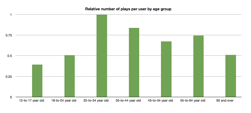 - People share listening accounts – this is perhaps the biggest confounding factor – that 64-year-old listener may be listening to music with their kids, their grand-kids, their neighbors and friends which means that not all of those plays should count as plays by a 64-year-old. Again, we don’t know how big this effect is, but it is certainly non-zero.