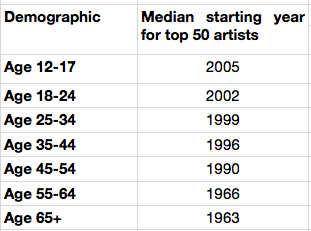 - The age data isn’t perfect – for instance, there are certainly a number of people that we think are 64-years-old but are not. This will skew the results to artists that are more generally popular. We don’t really know how big this affect is, but it is certainly non-zero.