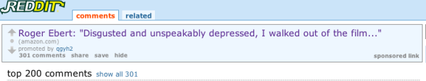 I found it a bit curious to see Amazon using such a horrendous review in an ad, but those folks at Amazon are clever. The ad has over 300 comments by Reddit readers meaning that many thousands have probably clicked on the ad to see which movie Ebert was talking about. Hundreds of comments, thousands of visitors all from a 10 word excerpt of a scathing review of the movie. Not too shabby.