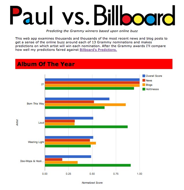 Since Billboard has also made some Grammy predictions, I thought it’d be interesting to do a post-facto comparison on how well each of us predicts the winners – thus the hack title ‘Paul vs. Billboard’.