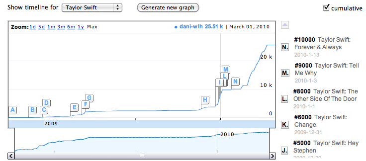 We think that understanding this relationship is key and so we are working to answer these questions via a research consortium between The Echo Nest, Yahoo Research and UMG unit Island Def Jam. In this consortium, three key elements are being brought together. Island Def Jam is contributing deep and detailed sales data for its music properties – sales data that is not usually released to the public, Yahoo! Research brings detailed search data (with millions and millions of queries for music) along with deep expertise in analyzing and understanding what search can predict while The Echo Nest brings our understanding of Intenet music activity such as playcount data, friend and fan counts, blog mentions, reviews, mp3 posts, p2p activity as well as second generation metrics as sentiment analysis, audio feature analysis and listener demographics . With the traditional sales data, combined with the online music activity and search data the consortium hopes to develop a predictive model for music by discovering correlations between Internet music activity and market reaction. With this model, we would be able to quantify the relative importance of a good review on a popular music website in terms of its predicted effect on sales or popularity. We would be able to pinpoint and rank various influential areas and platforms on the music web that artists should spend more of their time and energy to reach a bigger fanbase. Combining anonymously observable metrics with internal sales and trend data will give keen insight into the true effects of the internet music world.