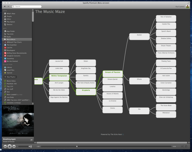 Getting the full Music Maze up and running took a little longer, mainly because I had to remove so much code to make it work. The Maze itself works really well in Spotify. There’s quite a bit of stuff that happens when you click on an artist node. First, an Echo Nest artist similarity call is made to find the next set of artists for the graph. When those results arrive, the animation for the expanding the graph starts. At the same time another call to Echo Nest is made to get an artist playlist for the currently selected artist. This returns a list of ‘good’ songs by that artist. The first one is sent off to Spotify for it to play. Click on a node again and the next song it that list of good songs plays. Despite all these web calls, there’s no perceptible delay from the time you click on a node in the graph until you hear the music.