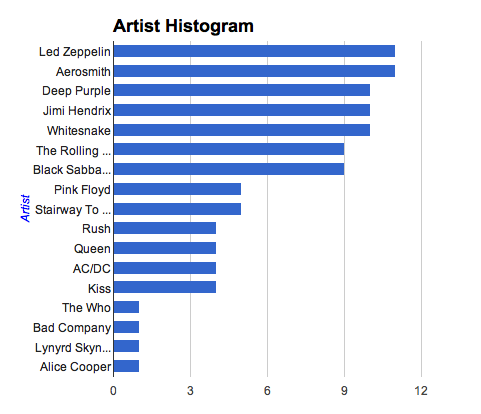 You can see that there is flatter distribution of artists in the playlist. You can use variety and distribution to tailor playlists to the listener. For instance, you can give the Classic Rock Radio experience to a listener by setting variety to relatively low, setting the distribution to focused and seeding with a classic rock artist like Led Zeppelin. Here’s the artist distribution for the resulting playlist: