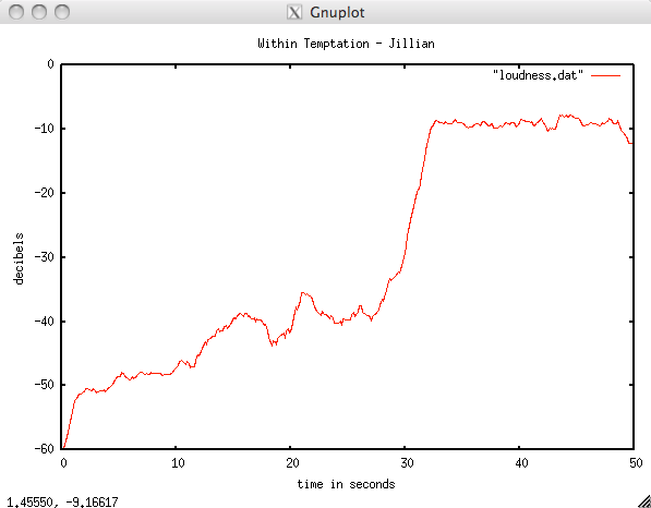 First up is the wonderfully upbeat I want to Die by Mortal Love. This 10 minute long song has a whopping drama score of 2014. There a full two minutes of quiet starting at 5 minutes into the song before the dramatic moment (with 16 dB of dramatic power!) occurs: