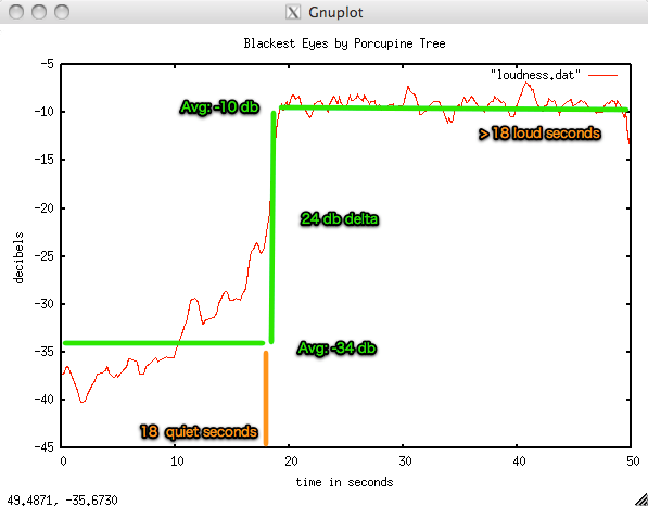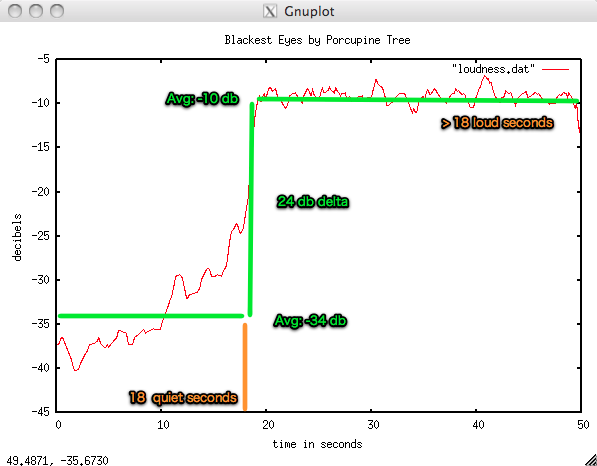 The opening 30 seconds of Blackest Eyes by Porcupine Tree fit the dramatic mold. Here’s an annotated loudness plot for the opening: