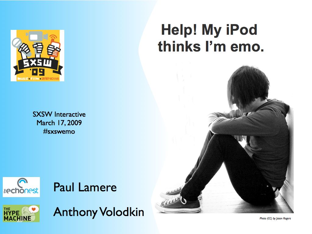 At SXSW 2009, Anthony Volodkin and I presented a panel on music recommendation called “Help! My iPod thinks I’m emo”. Anthony and I share very different views on music recommendation. You can read Anthony’s notes for this session at his blog: Notes from the “Help! My iPod Thinks I’m Emo!” panel. This is Part 1 of my notes – and my viewpoints on music recommendation. (Note that even though I work for The Echo Nest, my views may not necessarily be the same as my employer).