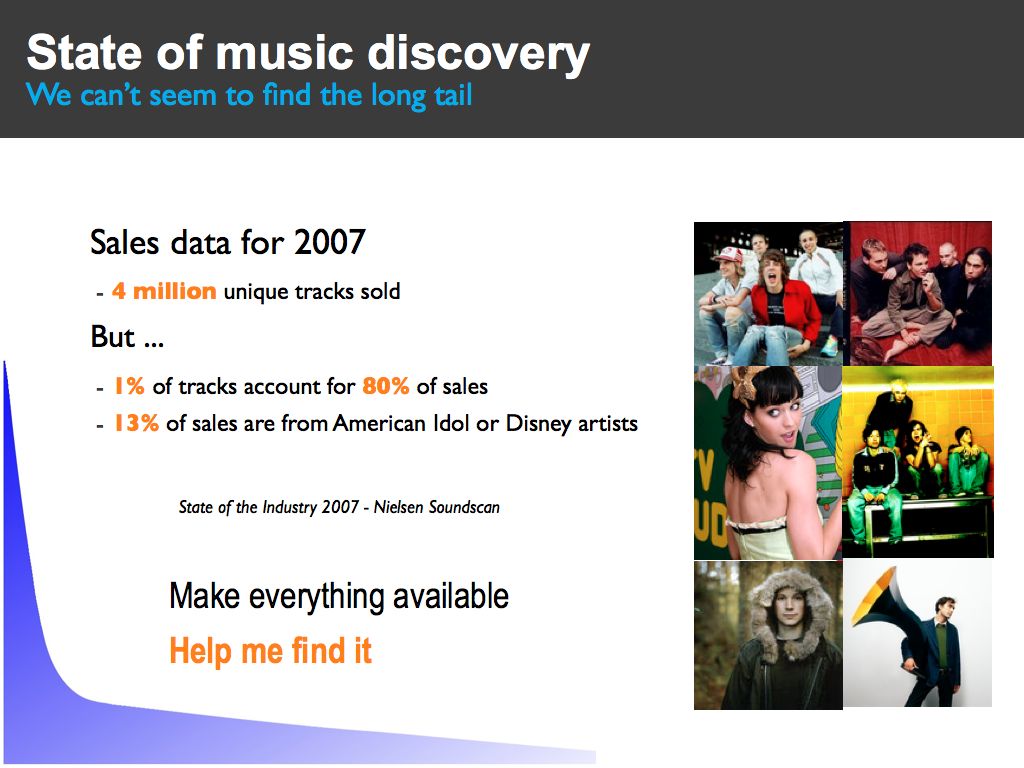 The world of music has changed dramatically. When I was growing up, a typical music store had on the order of 1,000 unique artists to chose from. Now, online music stores like iTunes have millions of unique songs to chose from. Myspace has millions of artists, and the P2P networks have billions of tracks available for download. We are drowning in a sea of music. And this is just the beginning. In a few years time the transformation to digital, online music will be complete. All recorded music will be online – every recording of every performance of every artist, whether they are a mainstream artist or a garage band or just a kid with a laptop will be uploaded to the web. There will be billions of tracks to chose from, with millions more arriving every week. With all this music to chose from, this should be a music nirvana – we should all be listening to new and interesting music.