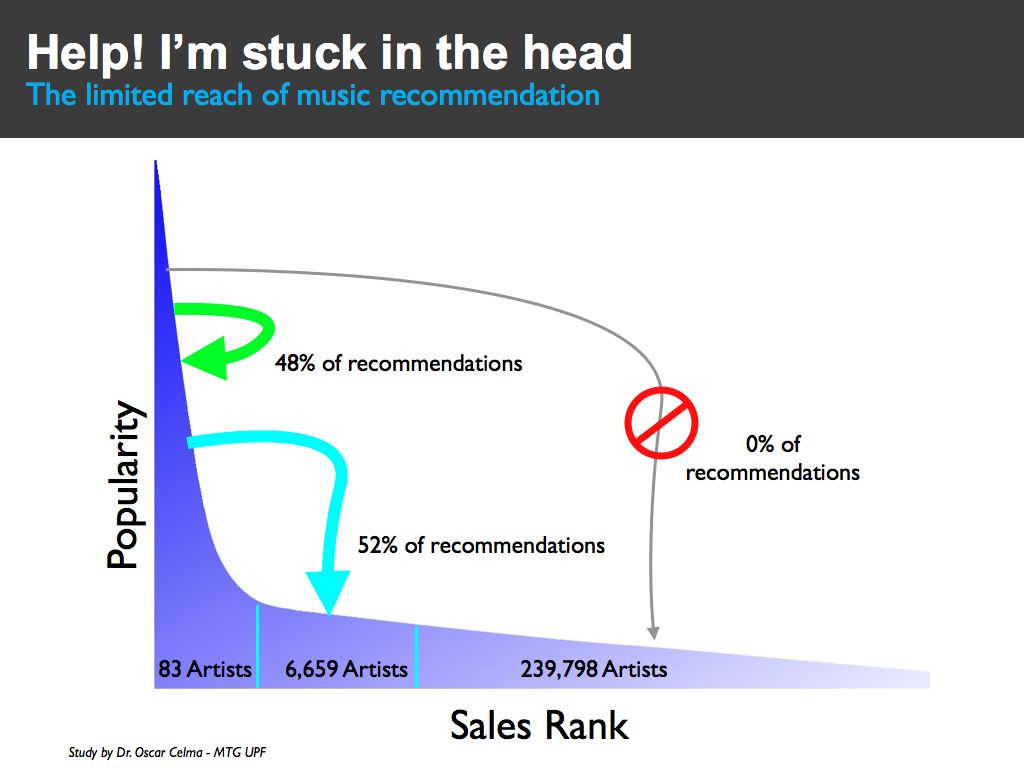 This is a study done by Dr. Oscar Celma of MTG UPF (and now at BMAT). Oscar was interested in how far into the long tail a recommender would get you. He divided the 245,000 most popular artists into 3 sections of equal sales – the short head, with 83 artists, the mid tail with 6,659 artists, and the long tail with 239,798 artists. He looked at recommendations (top 20 similar artists) that start in the short head and found that 48% of those recommendations bring you right back to the short head. So even though there are nearly a quarter million artists to chose from, 48% of all recommendations are drawn from a pool of the 83 most popular artists. The other 52% of recommendations are drawn from the mid-tail. No recommendations at all bring you to the long tail. The nearly 240,000 artists in the long tail are not reachable directly from the short head. This demonstrates the problem with commercial recommendation – it focuses people on the popular at the expense of the new and unpopular.