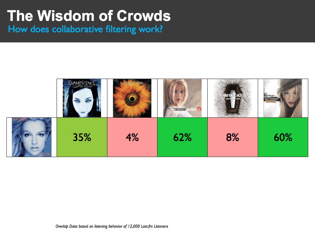 First lets take a look at how a typical music recommender works. Most music recommenders use a technique called Collaborative Filtering (CF). This is the type of recommendation you get at Amazon where they tell you that ‘people who bought X also bought Y’. The core of a CF recommender is actually quite simple. At the heart of the recommender is typically an item-to-item similarity matrix that is used to show how similar or dissimilar items are. Here we see a tiny excerpt of such a matrix. I constructed this by looking at the listening patterns of 12,000 last.fm listeners and looking at which artists have overlapping listeners. For instance, 35% of listeners that listen to Britney Spears also listen to Evancescence, while 62% also listen to Christina Aguilera. The core of a CF recommender is such a similarity matrix constructed by looking at this listener overlap. If you like Britney Spears, from this matrix we could recommend that you might like Christana and Kelly Clarkson, and we’d recommend that you probably wouldn’t like Metallica or Lacuna Coil.