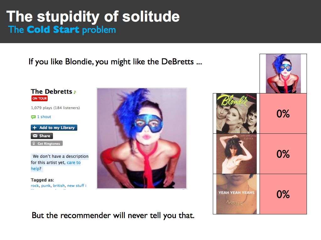 The DeBretts are a long tail artist. They are a punk band with a strong female vocalist that is reminiscent of Blondie or Patti Smith. (Be sure to listen to their song ‘The Rage’) .The DeBretts haven’t made it big yet. At last.fm they have about 200 listeners. They are a really good band and deserve to be heard. But if you went to an online music store like iTunes that uses a Collaborative Filterer to recommend music, you would *never* get a recommendation for the DeBretts. The reason is pretty obvious. The DeBretts may appeal to listeners that like Blondie, but even if all of the DeBretts listeners listen to Blondie the percentage of Blondie listeners that listen to the DeBretts is just too low. If Blondie has a million listeners then the maximum potential overlap(200/1,000,000) is way too small to drive any recommendations from Blondie to the DeBretts. The bottom line is that if you like Blondie, even though the DeBretts may be a perfect recommendation for you, you will never get this recommendation. CF systems rely on the wisdom of the crowds, but for the DeBretts, there is no crowd and without the crowd there is no wisdom. Among those that build recommender systems, this issue is called ‘the cold start’ problem. It is one of the biggest problems for CF recommenders. A CF-based recommender cannot make good recommendations for new and unpopular items.