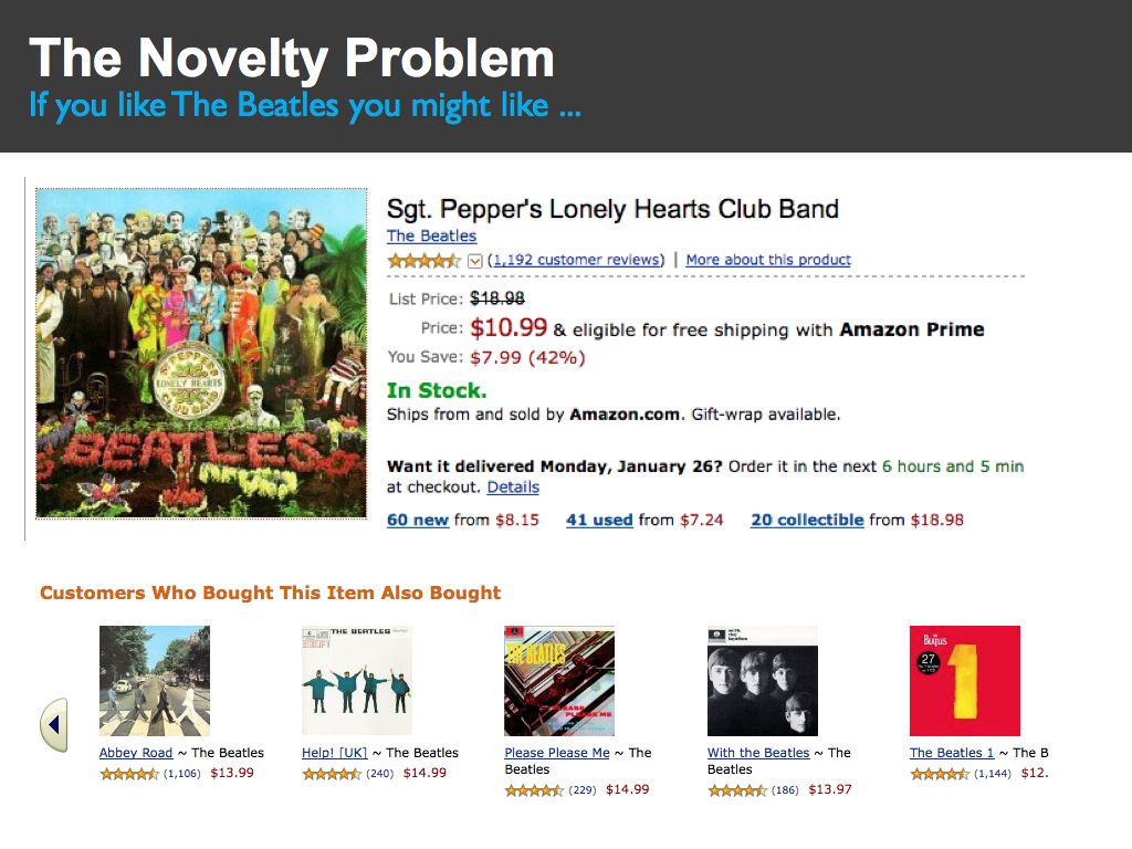 There is a difference between a recommender that is designed for music discovery and one that is designed for music shopping. Most recommenders are intended to help a store make more money by selling you more things. This tends to lead to recommendations such as this one from Amazon – that suggests that since I’m interested in Sgt. Pepper’s Lonely Hearts Club Band that I might like Abbey Road and Please Please Me and every other Beatles album. Of course everyone in the world already knows about these items so these recommendations are not going to help people find new music. But that’s not the point, Amazon wants to sell more albums and recommending Beatles albums is a great way to do that.