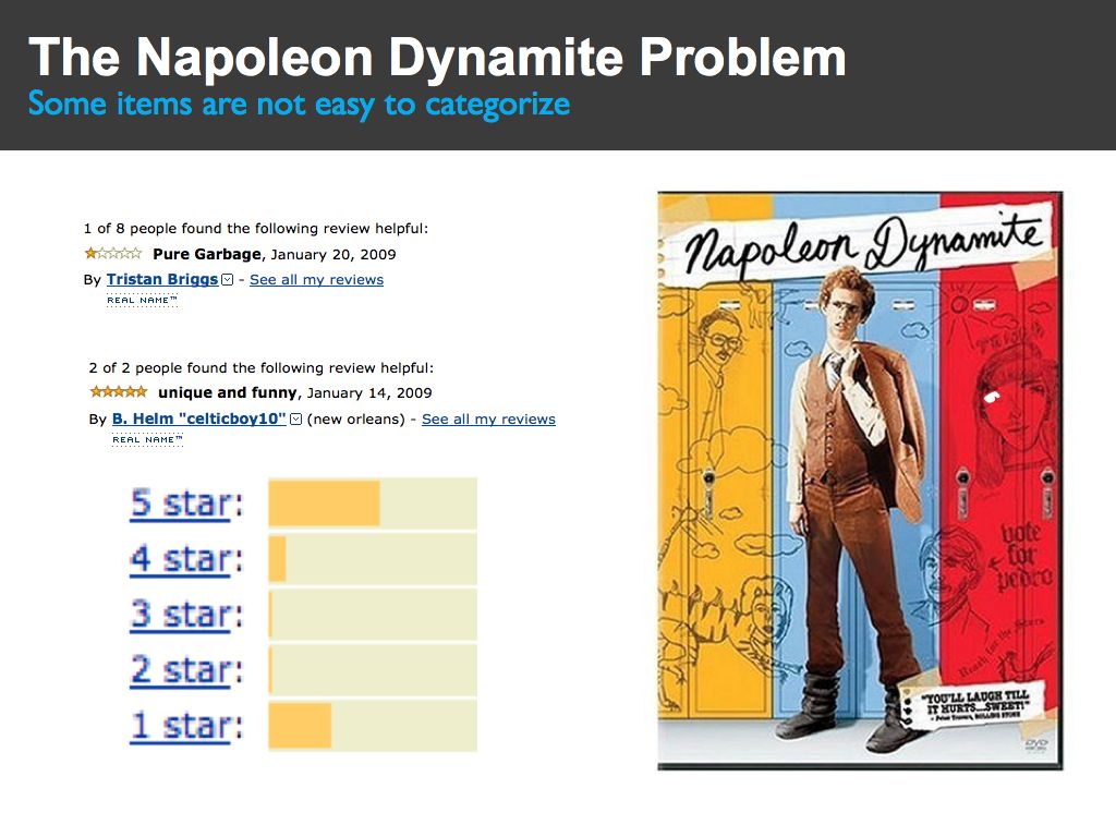 Some items are not always so easy to categorize. For instance, if you look at the ratings for the movie Napoleon Dynamite you see a bimodal distribution of 5 stars and 1 stars. People either like it or hate it, and it is hard to predict how an individual will react.