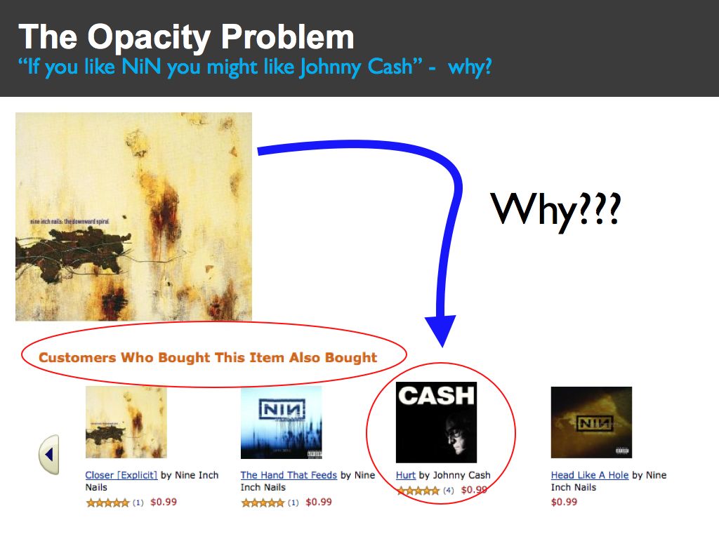 Here’s an Amazon recommendation that suggests that if I like Nine Inch Nails that I might like Johnny Cash. Since NiN is an industrial band and Johnny Cash is a country/western singer, at first blush this seems like a bad recommendation, and if you didn’t know any better you may write this off as just another broken recommender. It would be really helpful if the CF recommender could explain why it is recommending Johnny Cash, but all it can really tell you is that ‘Other people who listened to NiN also listened to Johnny Cash’ which isn’t very helpful. If the recommender could give you a better explanation of why it was recommending something – perhaps something like “Johnny Cash has an absolutely stunning cover of the NiN song ‘hurt’ that will make you cry.” – then you would have a much better understanding of the recommendation. The explanation would turn what seems like a very bad recommendation into a phenomenal one – one that perhaps introduces you to whole new genre of music – a recommendation that may have you listening ‘Folsom Prison’ in a few weeks.