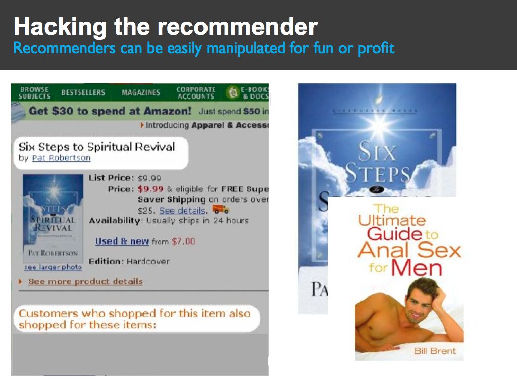Here’s a recommendation based on a book by Pat Robertson called Six Steps to Spiritual Revival (courtesy of Bamshad Mobasher). This is a book by notorious televangelist Pat Roberston that promises to reveal “Gods’s Awesome Power in your life.” Amazon offers a recommendation suggesting that ‘Customers who shopped for this item also shopped for ‘The Ultimate Guide to Anal Sex for Men’. Clearly this is not a good recommendation. This bad recommendation is the result of a loosely organized group who didn’t like Pat Roberston, so they managed to trick the Amazon recommender into recommending a rather inappropriate book just by visiting the Amazon page for Robertson’s book and then visiting the Amazon page for the sex guide.